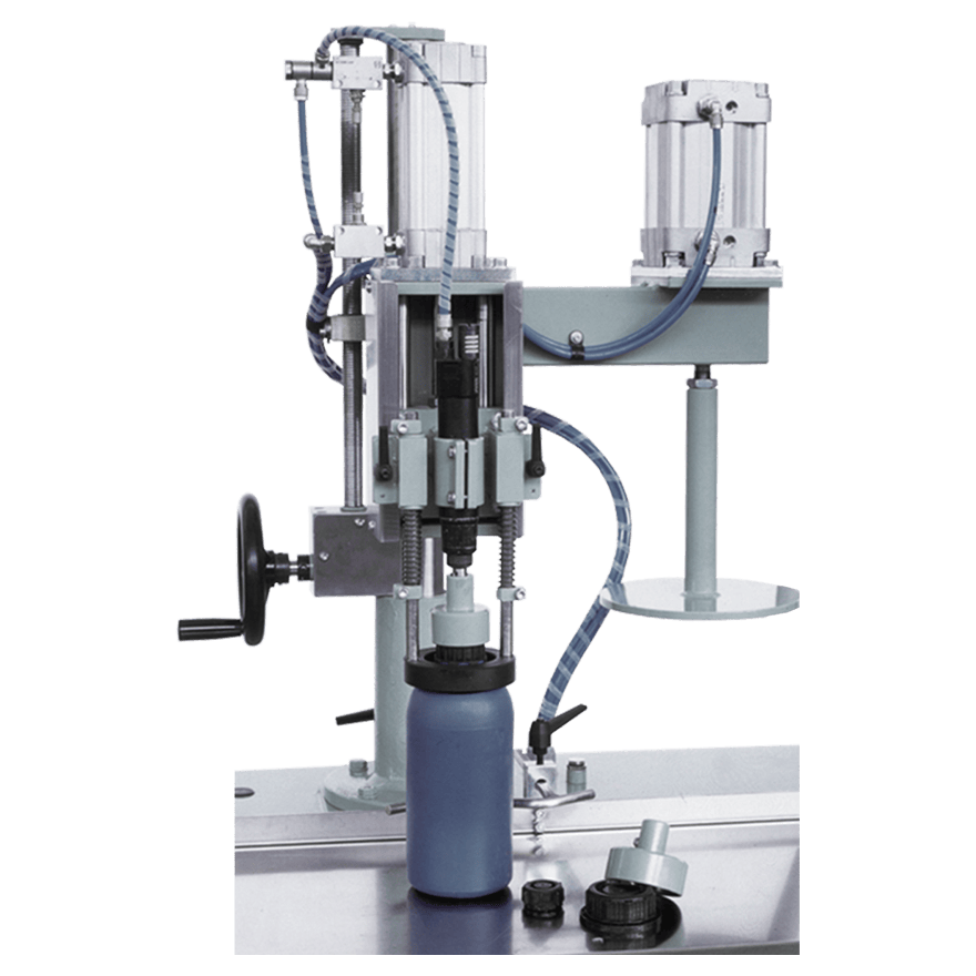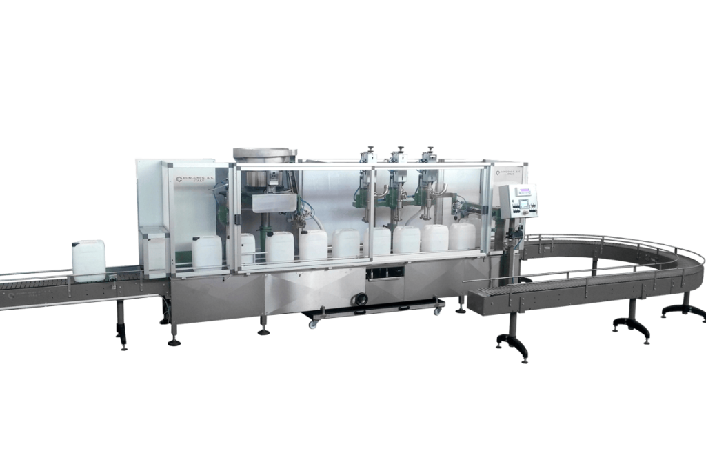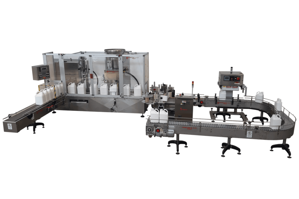 Machine suitable for packaging and closing of cylindrical, truncated conical, rectangular containers and drums. Suitable for liquid and pasty products, such as thinners, catalysts, oils, water-based paints, varnishes, coatings, stuccos, glues, enamel, emulsions, foaming products.